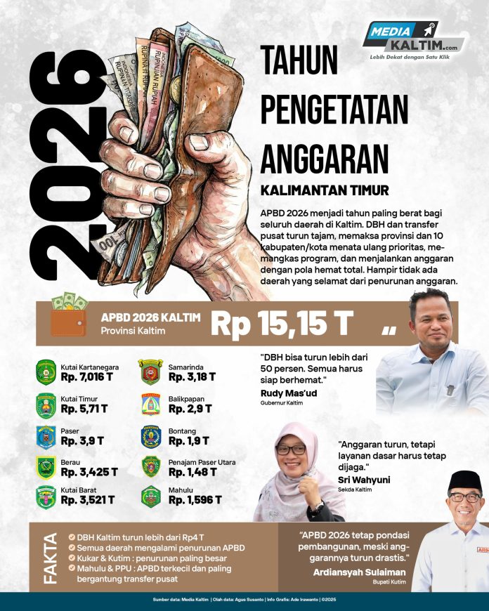 Kutai Timur mengalami kondisi serupa. Bupati Kutim Ardiansyah Sulaiman sudah menegaskan bahwa APBD 2026—yang hanya Rp5,71 triliun—tetap harus menjadi “pondasi pembangunan,” meski belanja dipangkas hampir separuh dari tahun sebelumnya. Kutim yang tahun lalu hampir menyentuh Rp10 triliun kini harus merasionalisasi TPP ASN, memangkas kegiatan non-prioritas, dan memperketat arah pembangunan.