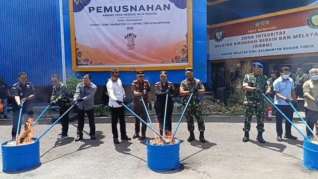 BALIKPAPAN– Direktorat Jenderal Bea Cukai (DJBC) Kalimantan Bagian Timur (Kalbagtim) dan Kantor Pengawasan dan Pelayanan Bea Cukai (KPPBC) Tipe Madya Pabean B Balikpapan melaksanakan pemusnahan terhadap berbagai barang ilegal hasil penindakan periode tahun 2023-2025, di halaman kantor Bea Cukai Kalbagtim pada Selasa (7/10/2025).