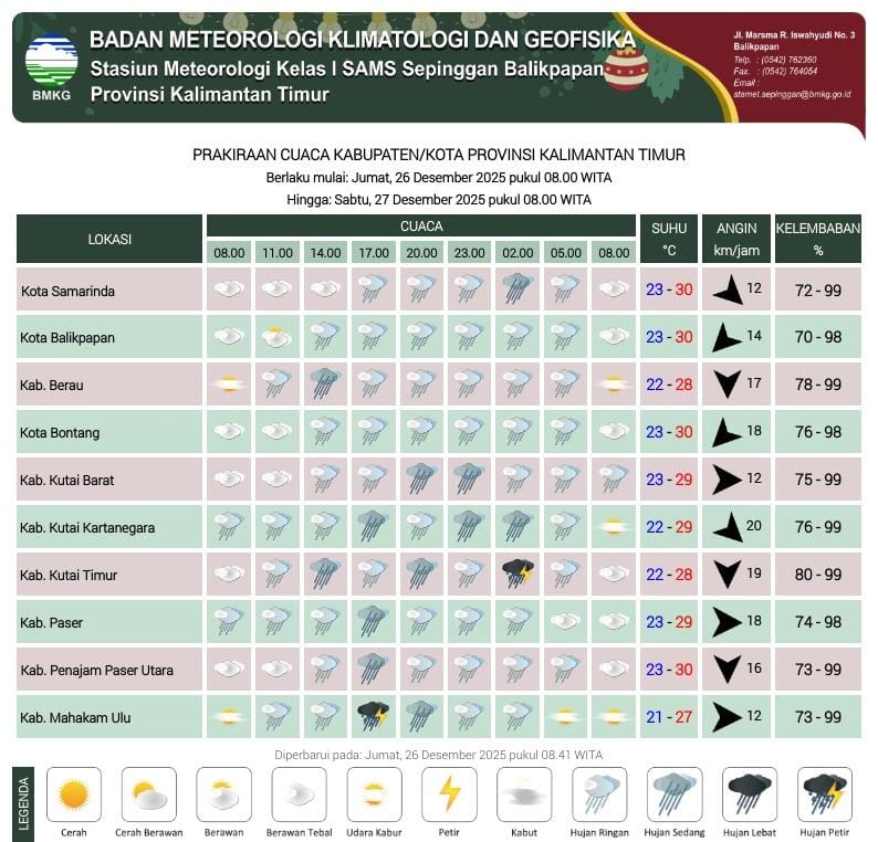 “Balikpapan dan Kalimantan di bulan Desember dan Januari adalah puncak curah hujan. Ini yang perlu di waspadain masyarakat,” ujarnya, Jumat (26/12/2025).