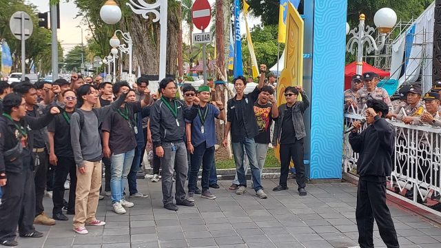 Masa yang mengenakan seragam hitam, menyuarakan sejumlah persoalan yang dialami Kota Balikpapan selama ini. Seperti MBG yang bermasalah dan belum merata, kekurangan guru, hingga banjir yang tidak tuntas di lakukan Pemerintah Kota Balikpapan.