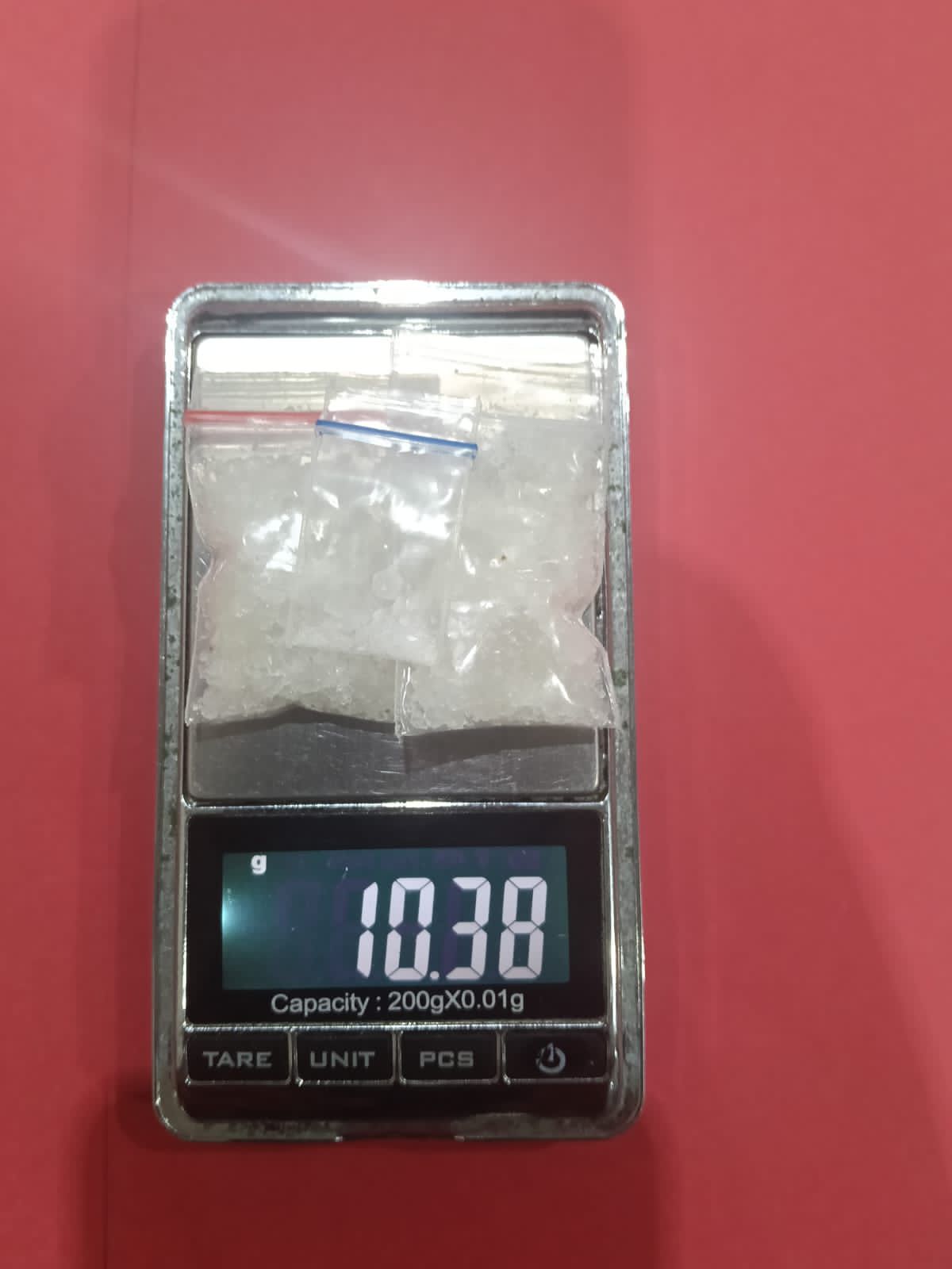 Di sebuah gudang di depan rumah, polisi menemukan satu plastik hitam yang dilakban cokelat. Setelah dibuka, di dalamnya terdapat tiga bungkus plastik bening berisi kristal putih yang diduga sabu dengan berat bruto 10,38 gram, dibungkus tisu putih.