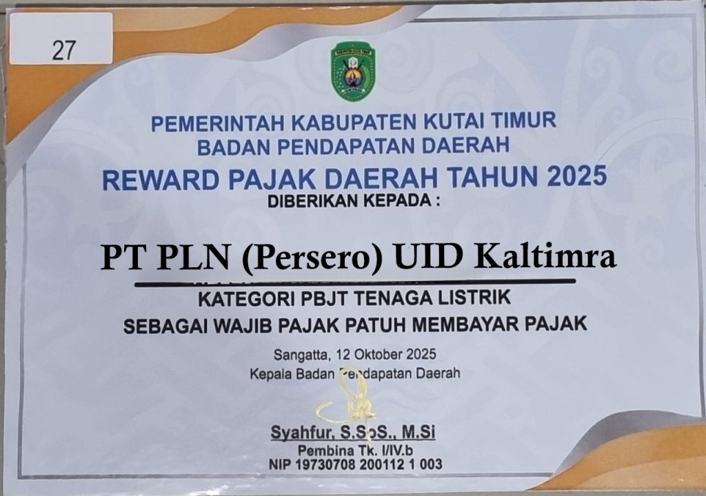 Penghargaan tersebut diserahkan langsung oleh Bupati Kutai Timur, H Ardiansyah Sulaiman, kepada PLN UID Kaltimra yang diwakili oleh Manager ULP Sangatta, Nur Salim. Diberikan dalam acara Reward Pajak Daerah Tahun 2025 yang digelar oleh Badan Pendapatan Daerah (Bapenda) Kabupaten Kutai Timur, bertepatan dengan peringatan Hari Ulang Tahun ke-26 Kabupaten Kutai Timur, pada Minggu (12/10/2025).