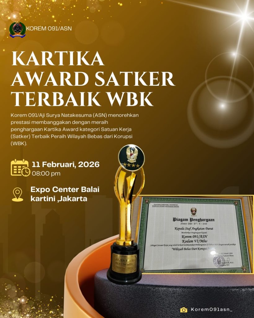 SAMARINDA – Korem 091/Aji Surya Natakesuma (ASN) menorehkan prestasi membanggakan di tingkat nasional dengan meraih penghargaan Kartika Award kategori Satuan Kerja (Satker) Terbaik Peraih Wilayah Bebas dari Korupsi (WBK).