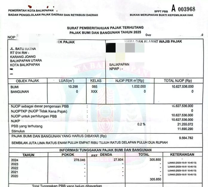 BALIKPAPAN – Viral di media sosial seorang warga Balikpapan, bernama Arif Wardhana membayar Pajak Bumi dan Bangunan (PBB) yang mengalami lonjakan. Dimana lokasi tanahnya berada di Jalan Batu Ratna KM 11 Balikpapan Utara.