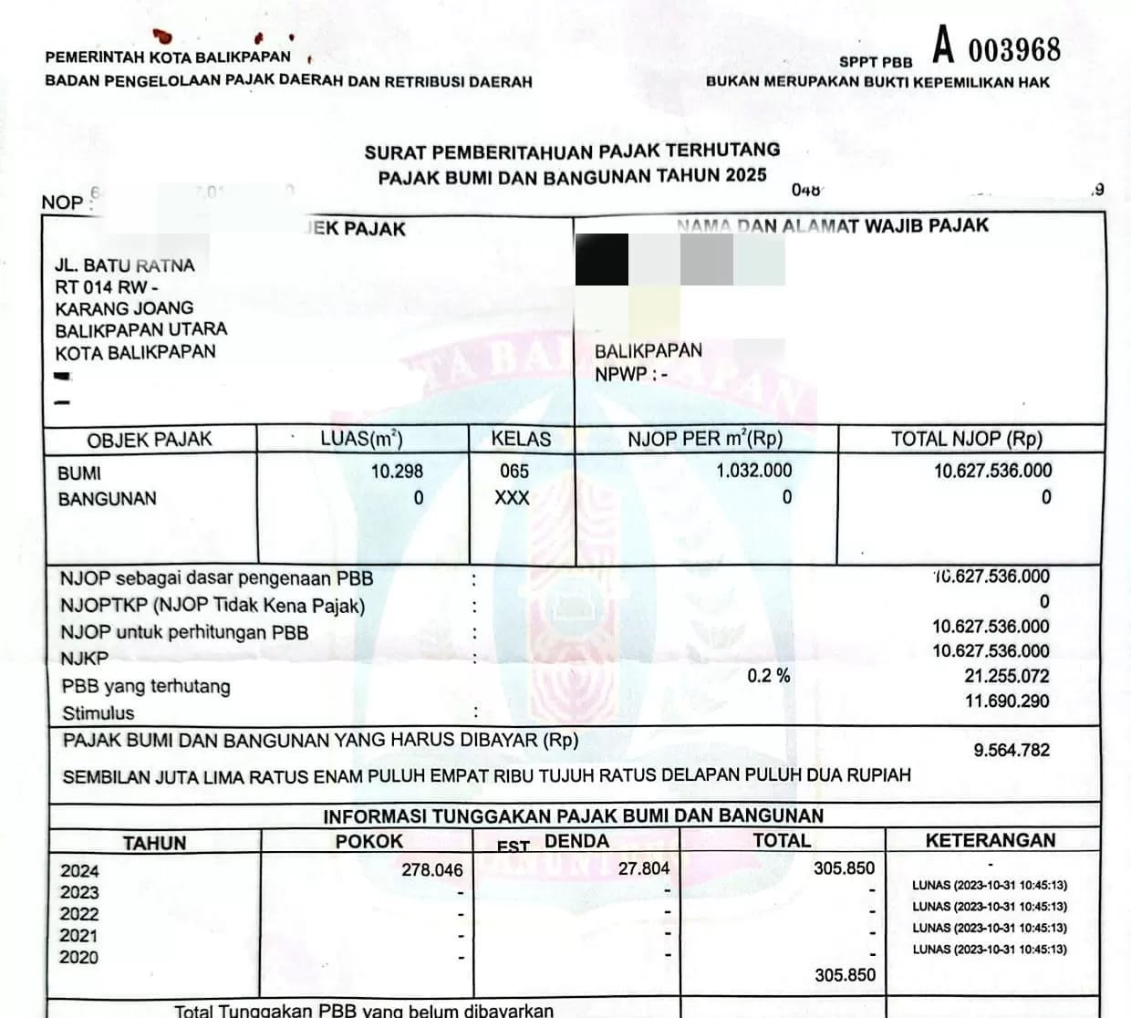 “Saat saya lihat SPPT, ternyata jumlah tagihan Rp 9,5 juta. Saya kaget sekali karena biasanya hanya Rp 306 ribu,” ujarnya.