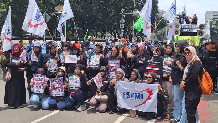 JAKARTA — Ratusan buruh dari berbagai serikat pekerja menggelar aksi unjuk rasa di kawasan Patung Kuda, Jalan Medan Merdeka Selatan, Jakarta Pusat, Senin (9/3/2026). Aksi tersebut digelar untuk memperingati Hari Perempuan Sedunia yang jatuh pada 8 Maret.