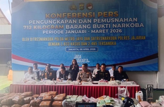 JAKARTA — Direktorat Reserse Narkoba Polda Metro Jaya mengungkap 1.833 kasus peredaran dan penyalahgunaan narkotika sepanjang Januari hingga Maret 2026. Dari pengungkapan tersebut, aparat berhasil menyita barang bukti dengan total mencapai 712,01 kilogram dari berbagai jenis narkotika.
