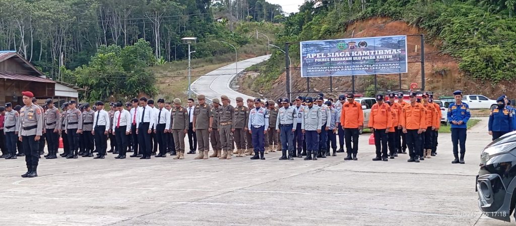 UJOH BILANG – Kepolisian Resor Mahakam Ulu (Polres Mahulu) menggelar apel siaga keamanan dan ketertiban masyarakat (Kamtibmas) dalam rangka pengamanan pelaksanaan ibadah puasa Ramadan 1447 H. Kegiatan tersebut berlangsung di halaman Makopolres Mahakam Ulu, Jalan Poros Ujoh Bilang, Kampung Ujoh Bilang, Kecamatan Long Bagun, Rabu (25/2/2026) pukul 17.16 Wita.