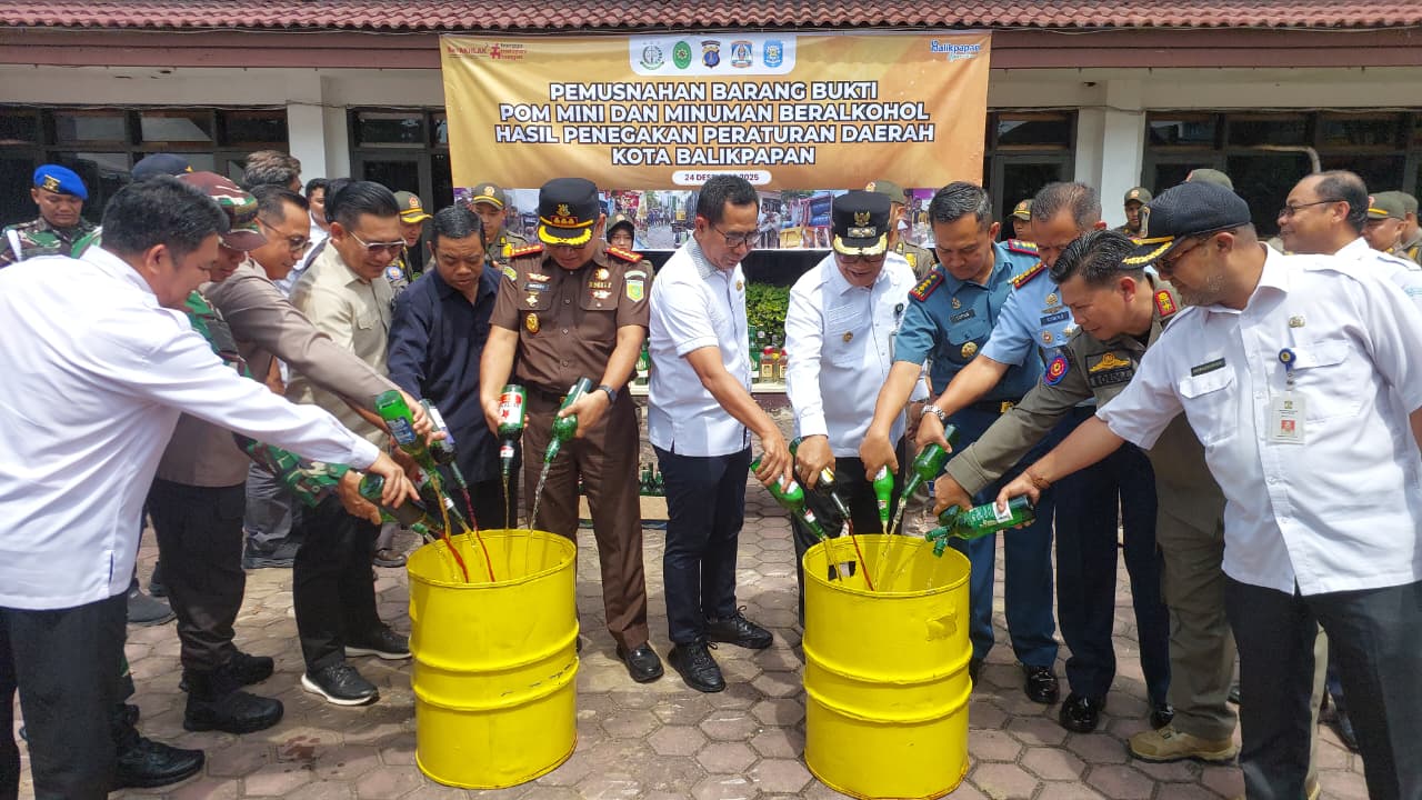 BALIKPAPAN — Satuan Polisi Pamong Praja (Satpol PP) Kota Balikpapan memusnahkan sebanyak 1.516 botol minuman keras (miras) dan 52 unit mesin pom mini ilegal, pada Rabu (24/12/2025).