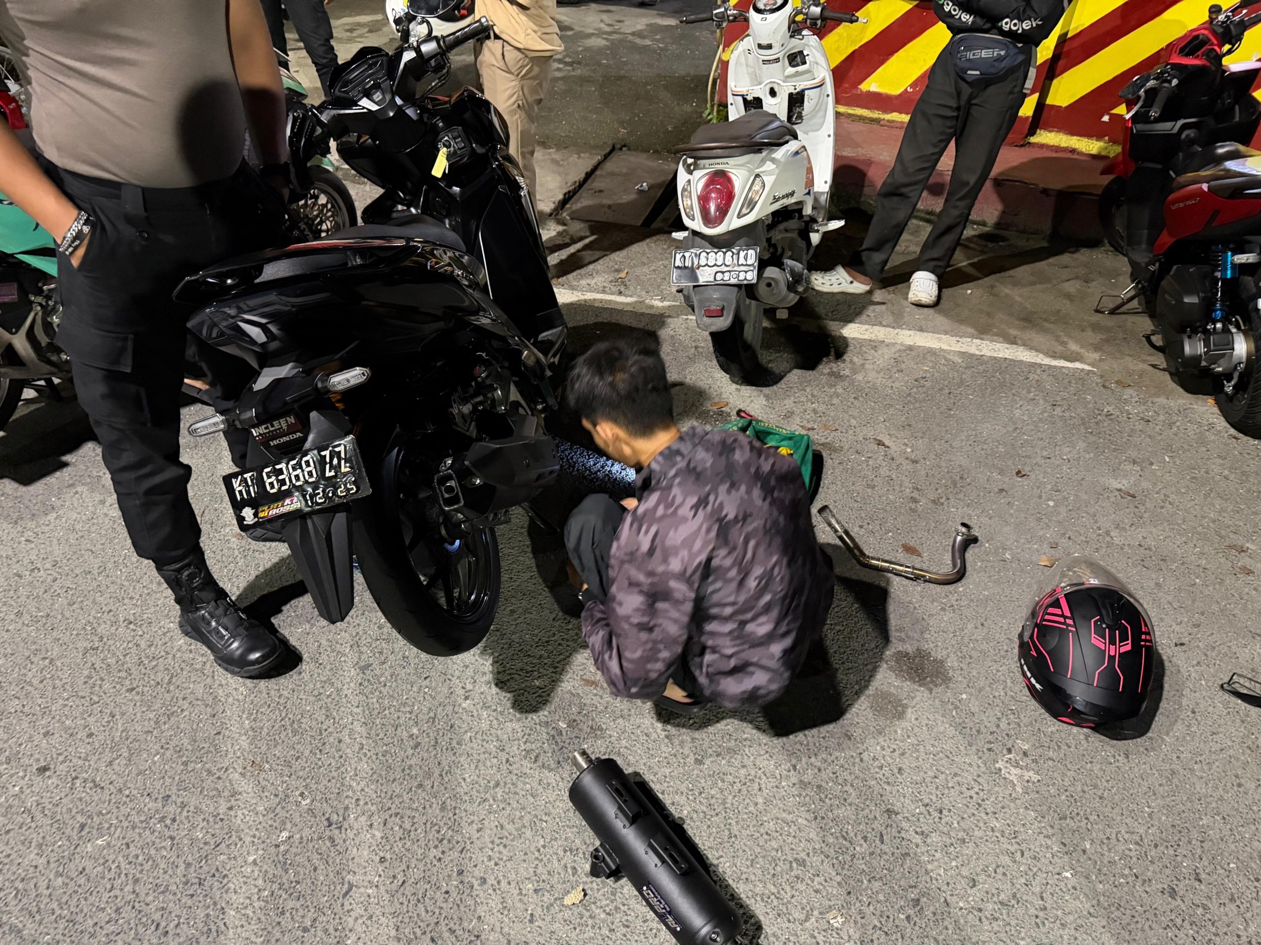BALIKPAPAN — Personel Patroli Motor (Patmor) Satuan Samapta Polresta Balikpapan melaksanakan penindakan terhadap kendaraan bermotor yang menggunakan knalpot brong saat patroli malam, Minggu (1/2/2026) dini hari.