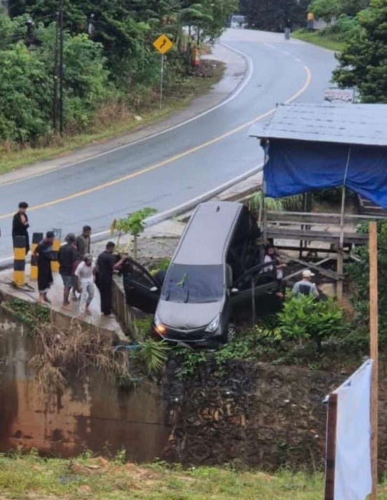 Tak jauh dari lokasi tersebut, sebuah mobil Multi-Purpose Vehicle (MPV) putih juga terlihat terperosok keluar jalur di dekat jembatan bungkuk Semoi Dua.