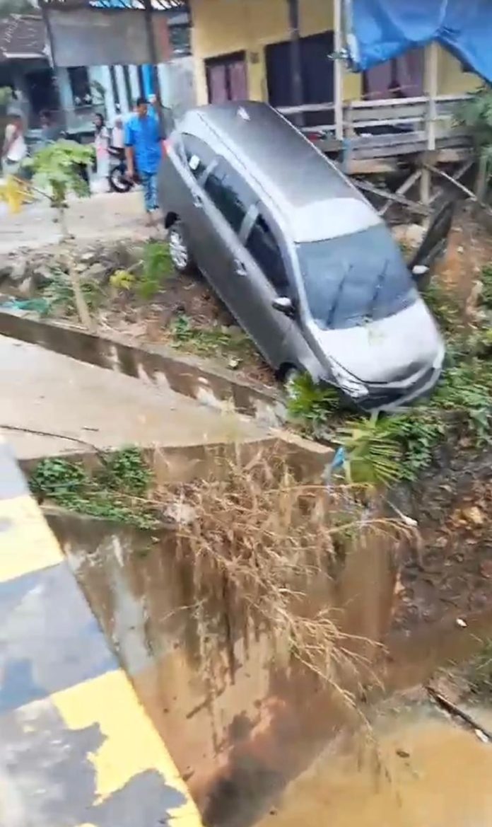 Tak jauh dari lokasi tersebut, sebuah mobil Multi-Purpose Vehicle (MPV) putih juga terlihat terperosok keluar jalur di dekat jembatan bungkuk Semoi Dua.