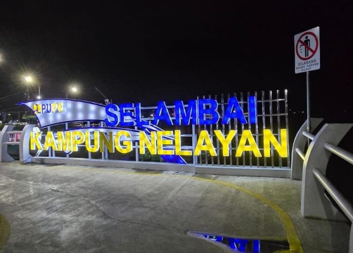 Bergerak sedikit lebih jauh, saya menemukan papan nama besar SELAMBAI di tepi pedestrian. Huruf kapital biru dilengkapi pencahayaan LED, dengan tulisan KAMPUNG NELAYAN berwarna kuning di bawahnya. Di sisi kiri terdapat logo Kementerian PUPR, sementara di kanan terpasang rambu larangan membuang sampah ke laut. Dari titik ini, jalur pedestrian memanjang ke arah masjid dengan lampu LED putih yang berjajar rapi. Kubah emas masjid terapung terlihat jelas dari kejauhan, menandakan akses kawasan kini tertata jauh lebih baik.