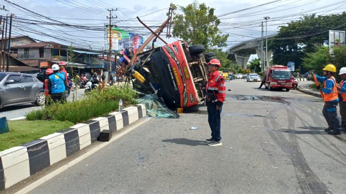 SAMARINDA — Sebuah kecelakaan tunggal melibatkan bus pariwisata milik PO Goraya terjadi di Jalan P. Untung Suropati, Kecamatan Sungai Kunjang, Samarinda, Senin (9/3/2026) sekitar pukul 09.00 Wita. Bus bernomor polisi H 7052 UA tersebut menabrak tiang listrik dan median taman jalan setelah diduga mengalami kegagalan sistem pengereman.