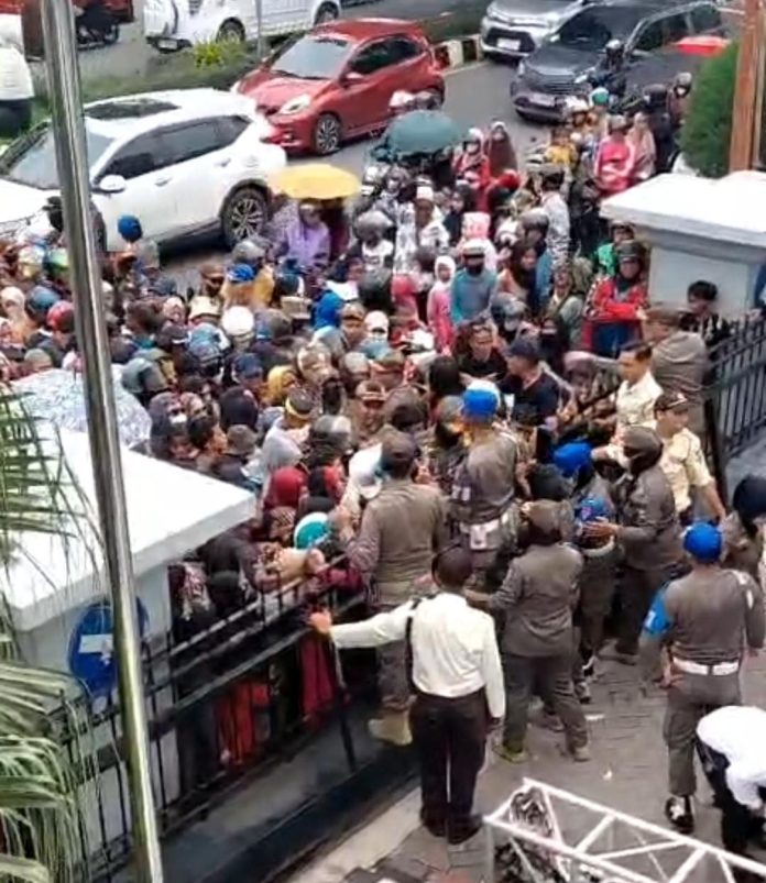 Di luar pagar, massa berdesakan mencoba masuk. Di dalam area kantor gubernur, antrean juga sudah mengular. Satpol PP terlihat berusaha mengatur kerumunan agar tidak semakin padat.