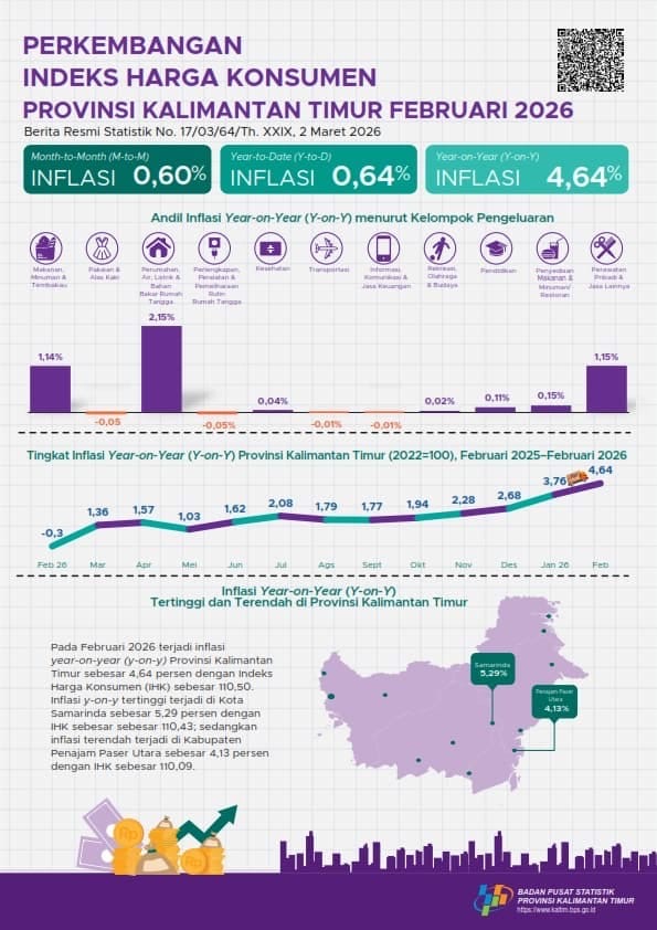 SAMARINDA — Badan Pusat Statistik (BPS) mencatat inflasi tahunan di Provinsi Kalimantan Timur pada Februari 2026 mencapai 4,64 persen. Angka tersebut menunjukkan adanya kenaikan harga barang dan jasa secara umum dibandingkan dengan periode yang sama pada tahun sebelumnya.